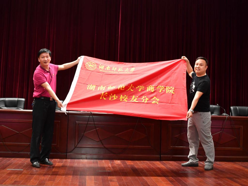 彭正乔向商学经理沙员工会授会旗。李军、何勇向理事会成员颁发聘书。