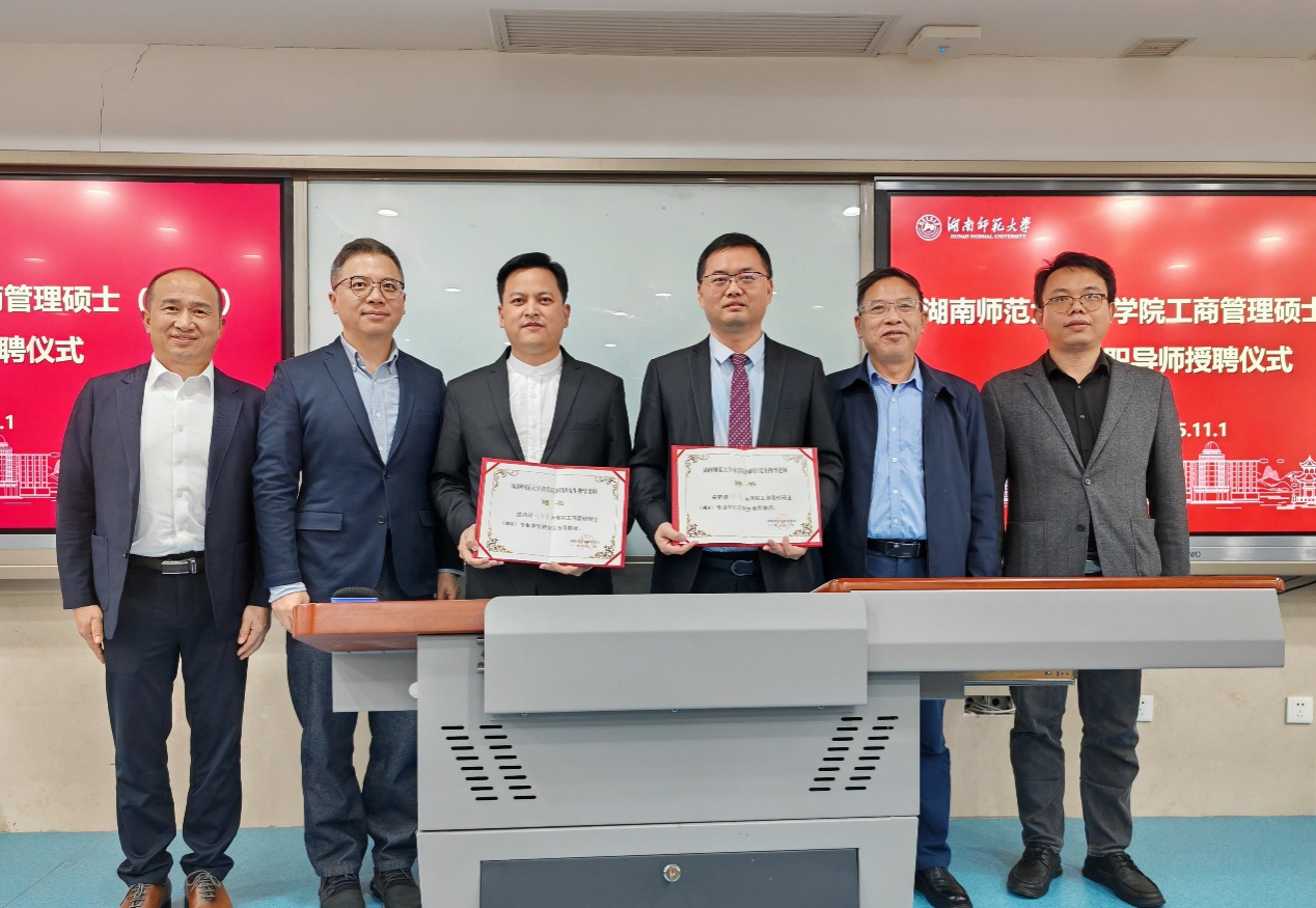 2025年11月1日下午,公司在中和楼401教室举行MBA兼职导师授聘仪式,正式聘请湖南诸葛定位咨询有限公司董事长刘亮、总经理刘智勇为公司兼职导师。仪式由beats365原经理、MBA学位点负责人李军教授主持,副经理(主持工作)曹虹剑教授,MBA学位点执行负责人、中心主任蒋才芳教授,导师代表戴家武等参与授聘仪式。