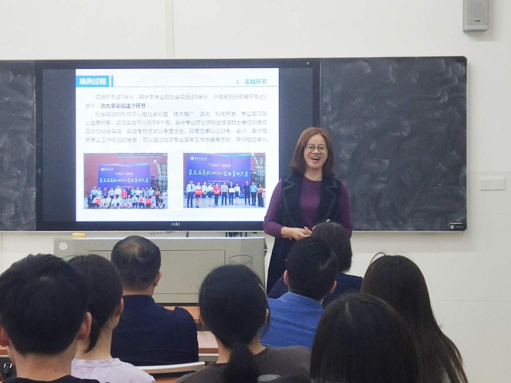 首先,马巾英老师对MPAcc专业的产生及发展现状进行简单介绍。她指出,今年是MPAcc专业招生的第二年,会计专业拥有较强的团队力量,并且拥有丰富的科研成果,能为同学们的科研和学习带来实质性帮助。随后,她根据公司的要求及专业的特点,对参会员工提出三方面的要求:学业成绩达标、导师认可的科研与案例研究成果、案例研究与案例大赛的课时安排。同时,她依次介绍了MPAcc专业12位导师的基本情况以及研究方向。为帮助导师了解班级情况以及此次参会员工信息,班长谭蜜和学习委员徐婉婷代表全班员工进行发言。在最后的双选环节中,导师与员工进行自由交流,完成导师的选定。