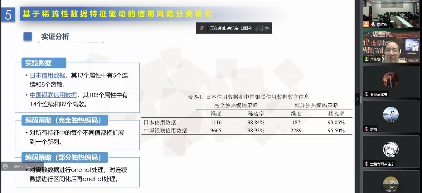 余乐安教授首先指出,信用风险作为《巴塞尔协议》规定的银行三大风险之一,其在金融风险管理领域至关重要。在这样一个信息爆炸的时代,信用评估体系中越来越多的变量被纳入考虑,随之而来的是信用风险评估过程中日渐凸显的变量数据特征问题。其中,非均衡性、缺失性和稀疏性作为数据特征中常见的问题,对信用风险分类结果影响很大。基于这一背景,余乐安教授对现有文献进行梳理并针对已有文献的不足之处,试图从三个典型数据特征出发构建与之相匹配的信用风险分类模型,以此来提升信用分类的预测效果,并通过真实信用数据进行验证。实证结果表明,针对非均衡数据问题,重采样SVM-DBN集成学习模型可有效提高分类性能;独热编码预处理模型有效缓解了信用分类中的数据缺失问题;RBM-PCA预处理模型对信用风险中常见的数据稀疏问题提供了可靠的解决方案。